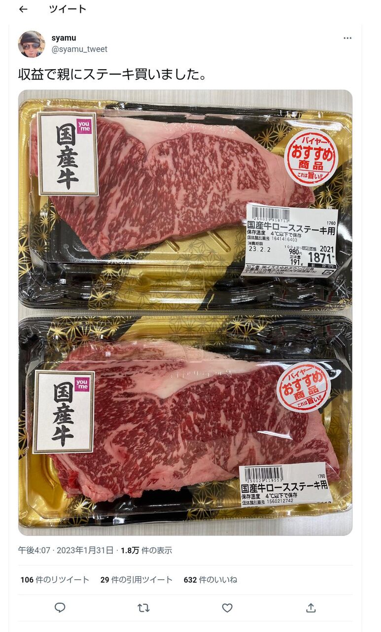 コメントで指摘されたからか、想像してた量の刺身買おうとしたらステーキの方が安かったのか。