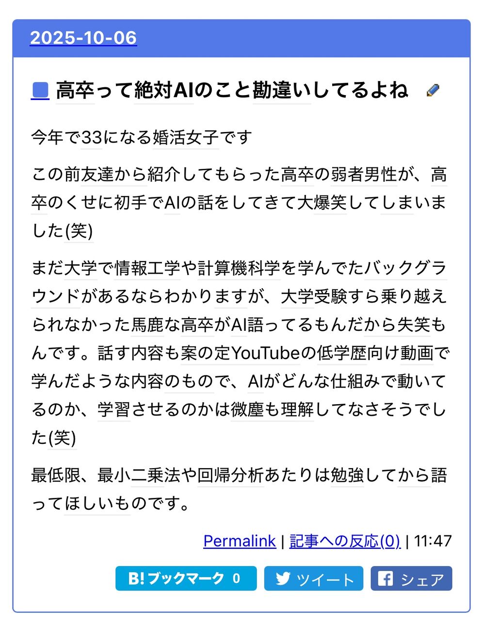 高卒のAI論者の方が社会的には生産性あって良いよね