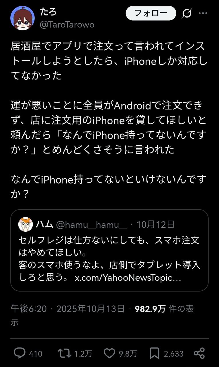 そもそもiPhoneでないと注文出来ないってアプリインストールされるってことやろ?