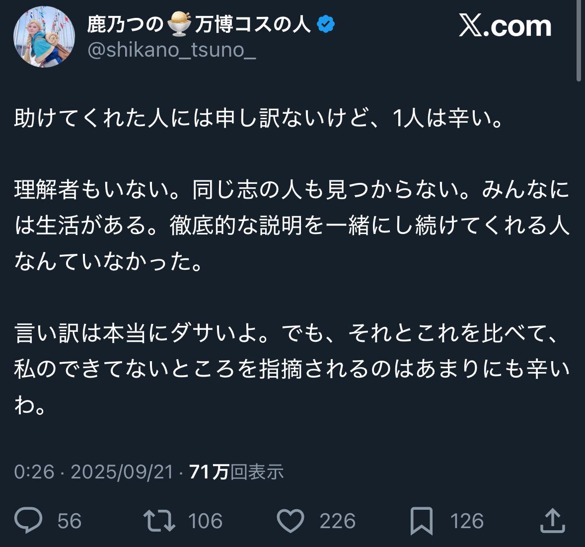 【悲報】鹿乃つの、オフ会を開催するも参加者0 2025年09月23日 カテゴリ:バーチャルYoutuber 1: 大物Youtuber速報 2025/09/21(日) 21:40:24.32 ID:5vlJcvSu0 日曜日に開催しておいて「みんな忙しいから」と言い訳中 👌👽👌 続きを読む 👌👽👌