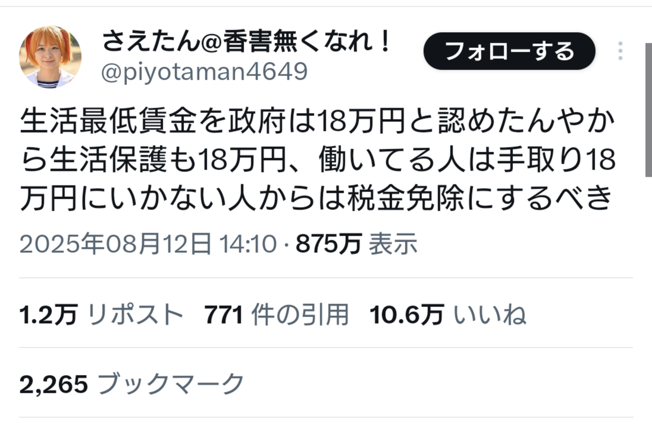 有権者「最低賃金が18万相当なら生活保護も18万にすべき!」←10万いいね 2025年08月18日 カテゴリ:キモオタ陰キャなんj民 1: 大物Youtuber速報 2025/08/17(日) 05:12:50.64 ID:flmlV4590 これマジ? 👌👽👌 続きを読む 👌👽👌 タグ :#生活保護#ナマポ