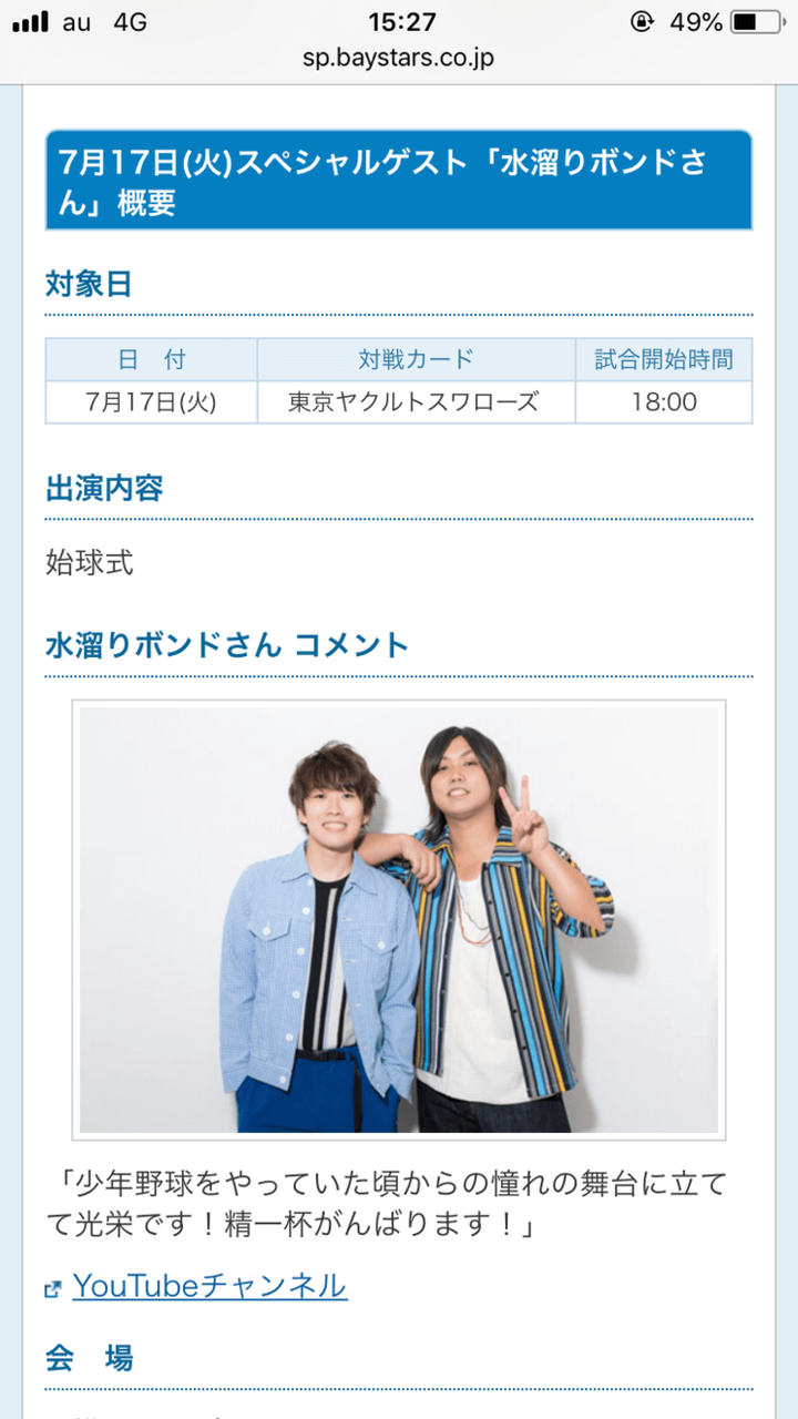 【悲報】ハメカス、始球式に水溜りボンドを呼ぶwww 2018年07月17日 カテゴリ:水溜りボンド 1: 大物Youtuber速報 2018/07/16(月) 15:26:47.85 ID:uiQTcnxda 7月18日(水)に行われる東京ヤクルトスワローズ戦における『キッズ STAR☆NIGHT 2018 Supported by J:COM』、 7月20日(金)~22日(日)に行われる阪神タイガース3連戦における『キッズスタジアム2018』の各キッズイベント開催に先駆け、7月17日(火)スペシャルゲストとして、 子供たちに大人気のYouTuber「水溜りボンド」さんのセレモニアルピッチへの登場が決定しました! 当日は、水溜りボンドさんのトミーさんがマウンドにあがり、 子供のころからの憧れであった横浜DeNAベイスターズ選手との対決も! 当日の模様やイベントに対する意気込みなどは、後日YouTubeで配信いたします。 お楽しみください! 👌👽👌 続きを読む 👌👽👌 タグ :#水溜りボンド#横浜DeNAベイスターズ#ハメカス
