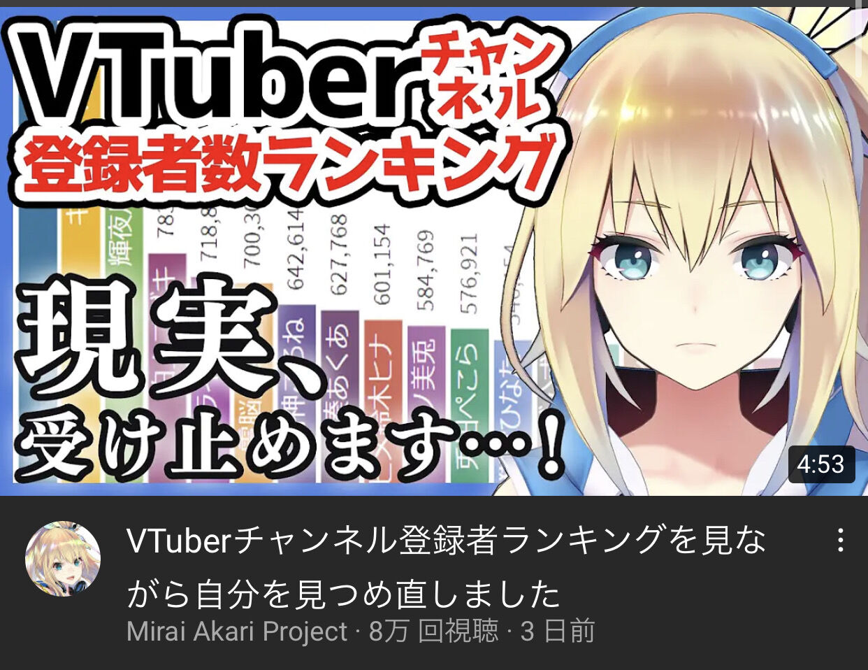 ミライアカリ(可愛い、歌上手い、トーク力ある)←こいつが天下取れなかった理由 2020年09月23日 カテゴリ:バーチャルYoutuber 1: 大物Youtuber速報 2020/09/11(金) 08:46:12.55 ID:5S6iVOIR0 なに 👌👽👌 続きを読む 👌👽👌 タグ :#ミライアカリ