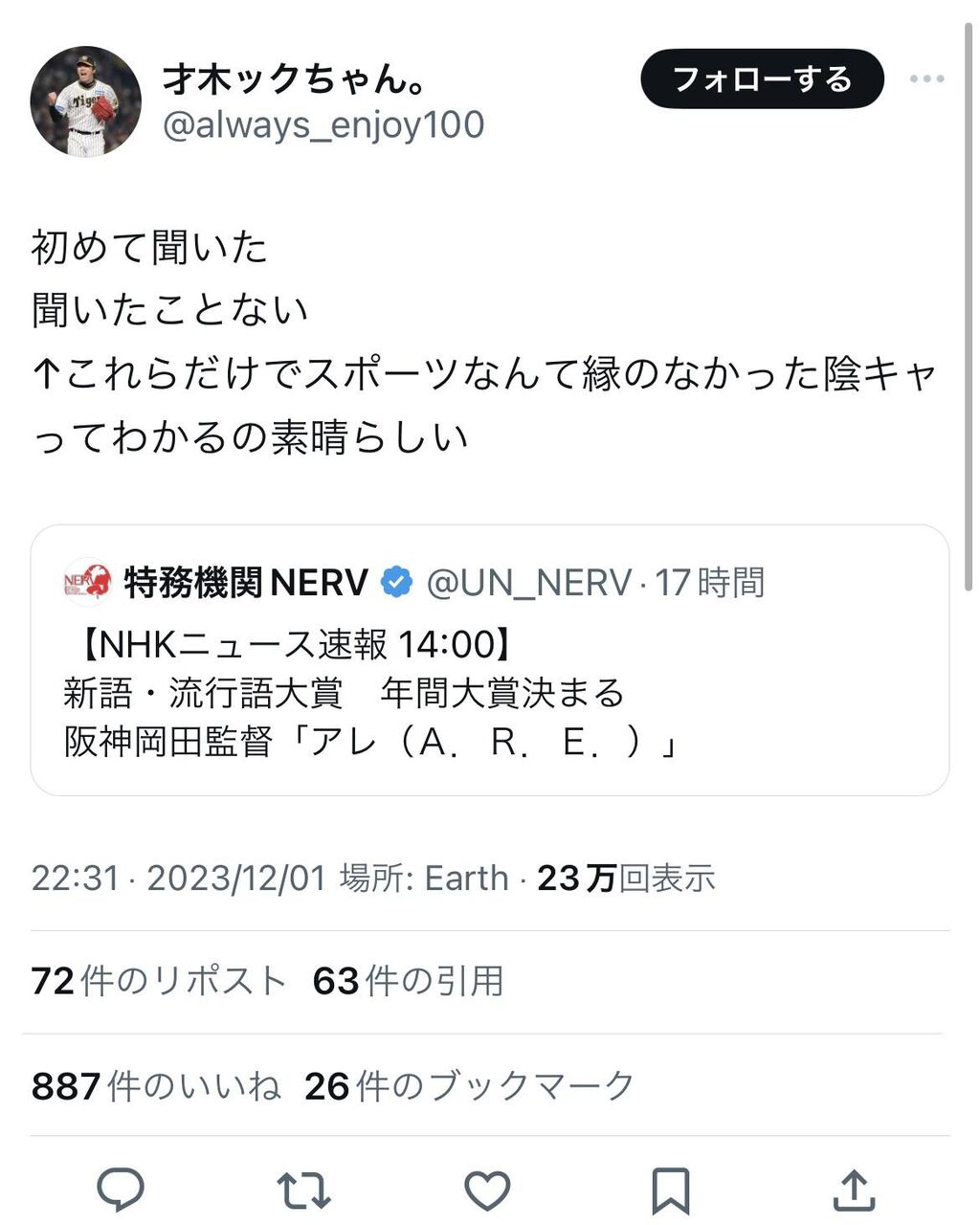 陽キャさん「流行語大賞のアレがわからない奴はスポーツ経験無しの陰キャです」 2023年12月06日 カテゴリ:キモオタ陰キャなんj民 1: 大物Youtuber速報 2023/12/02(土) 07:40:53.17 ID:cAkV7+jk0 たしかに 👌👽👌 続きを読む 👌👽👌 タグ :#陰キャ#陽キャ